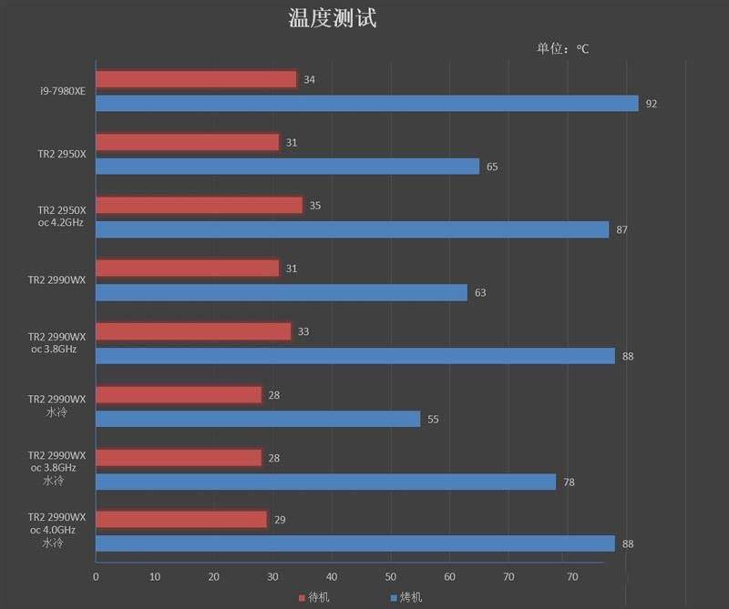 对于2990wx:使用风冷散热器时,默频状态下,待机温度为31度,烤机温度63度;超频到1.28v 3.8ghz之后,烤机温度上升到了88度;4ghz的频率不再使用风冷散热器作测试。