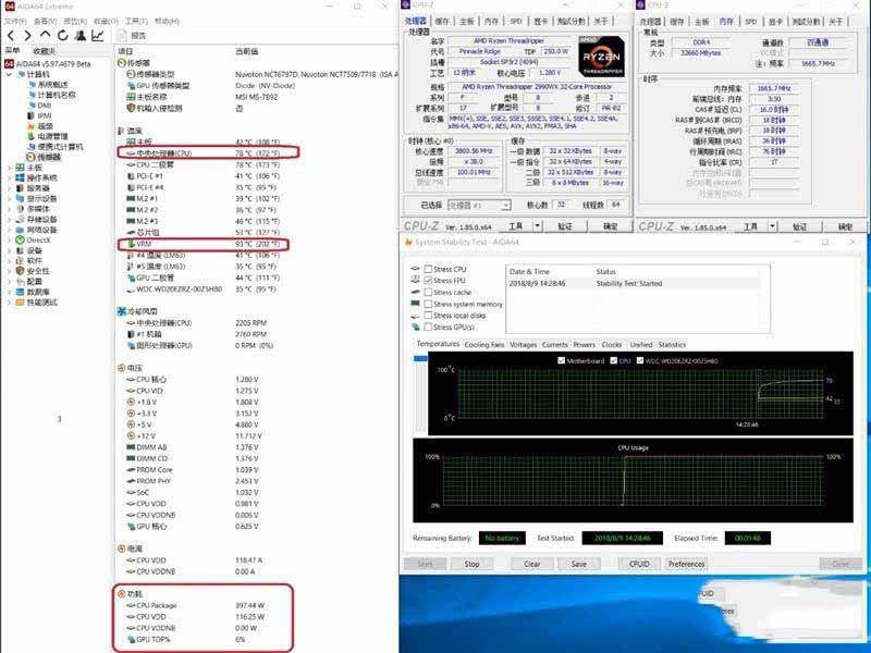 将2990wx超频到1.28v 3.8ghz时候,使用水冷散热。运行aida64 fpu 5分钟,此时cpu核心功耗达到了400w,cpu温度为78度,主板供电mosfet温度为91度,仍在可控范围之内。