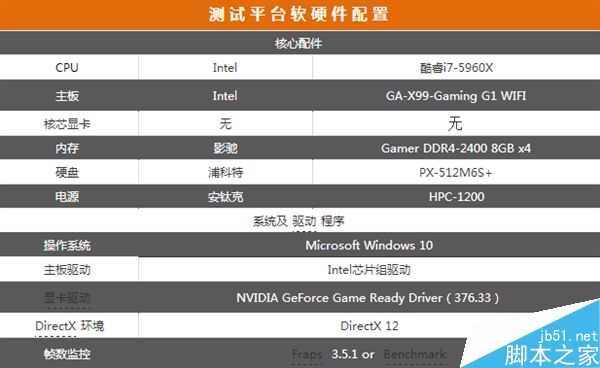为保证测试能够发挥显卡的最佳性能,本次测试平台采用最强酷睿芯——intel酷睿i7-5960x处理器、技嘉x99芯片组主板、影驰 gamer ddr4-2400 8gb 四通道内存、安钛克1200w金牌电源组建而成。详细硬件规格如下表所示: