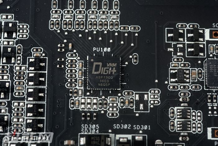 猛禽系列的pcb是大家比较熟悉的,首先大家可以看到7+1相华硕订制的sap ii电感和来自钰邦的5kw10系列电容,三星k4g80325fb-hc25显存芯片,ir 3555m mosfet,供电主控为asp 1300系列,