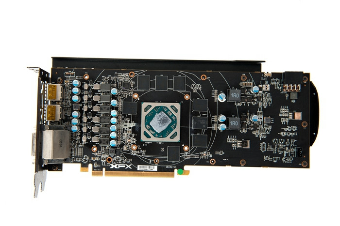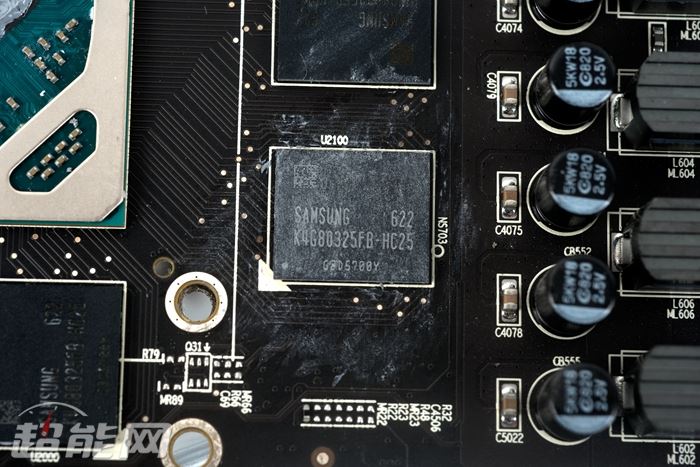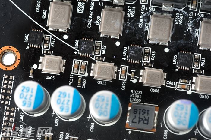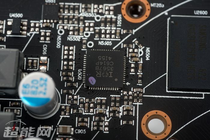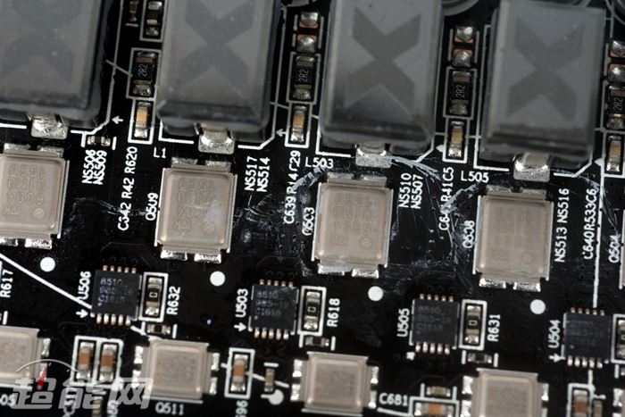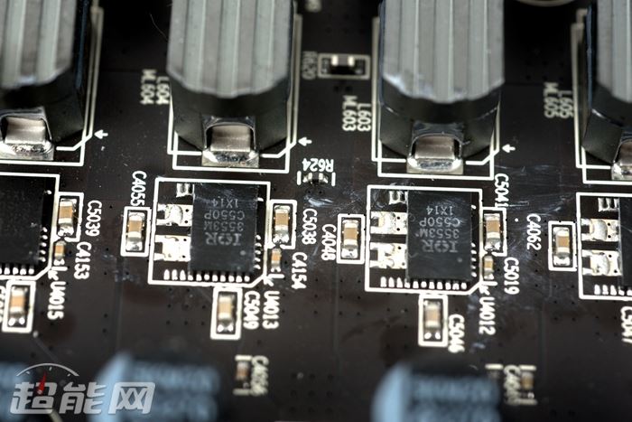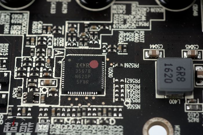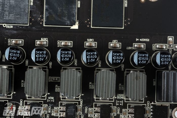 讯景的黑狼拥有6+2相供电,其中6相为ture x全金属封装铁素体电感,ir 3555m mosfet,ir 3567b供电主控,电容方面特征不多,可以确定的是820uf、限压2.5v的固态电容。