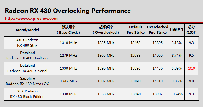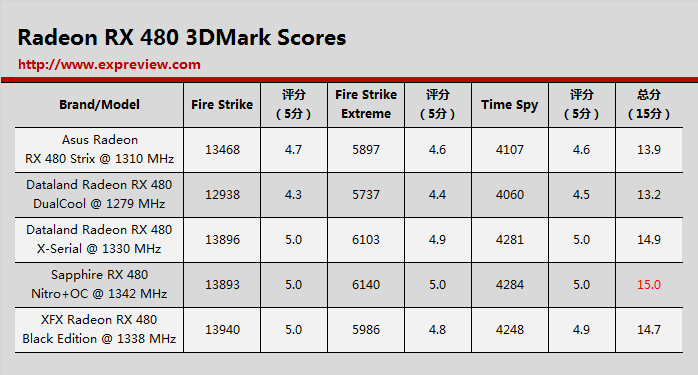 和我们猜测的接近,基准频率为1338 mhz的讯景黑狼进化取得最高的成绩:13940分,迪兰的“x”系列紧追在后取得13896分,蓝宝石的超白金系列获得13893分,他们三者之间的差距很小,同时也作为性能最高的radeon rx 480第一梯队可以获得5分满分,在这之后是主频稍低的华硕猛禽系列取得13468分,与第一梯队有四百多分的差距,因此获得4.7分,至于本身就并非定位于性能竞争力迪兰酷能系列获得12938分,排名最后,获得4.3分。可见基本上性能高低还是很大程度上依赖于频率。