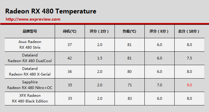 其中华硕猛禽系列的功耗控制最为亮眼,待机功耗为19.3w,负载功耗213.2w为最低的一张,可以打满分10分,而迪兰的“x”系列和讯景的黑狼系列的表现也很接近,可以获得9.4分,迪兰酷能的表现也很接近,可以获得9.0分,功耗最大的也是频率设定最高的蓝宝石超白金,最后拿到8.7分。