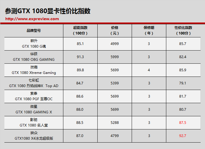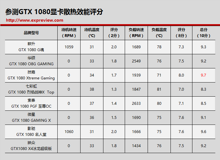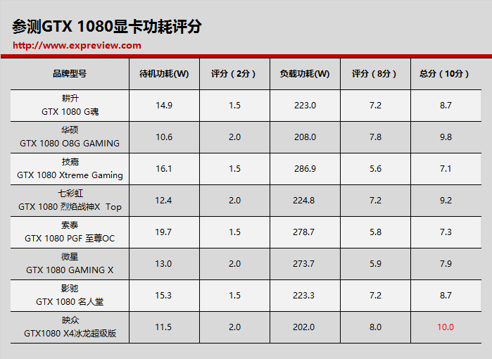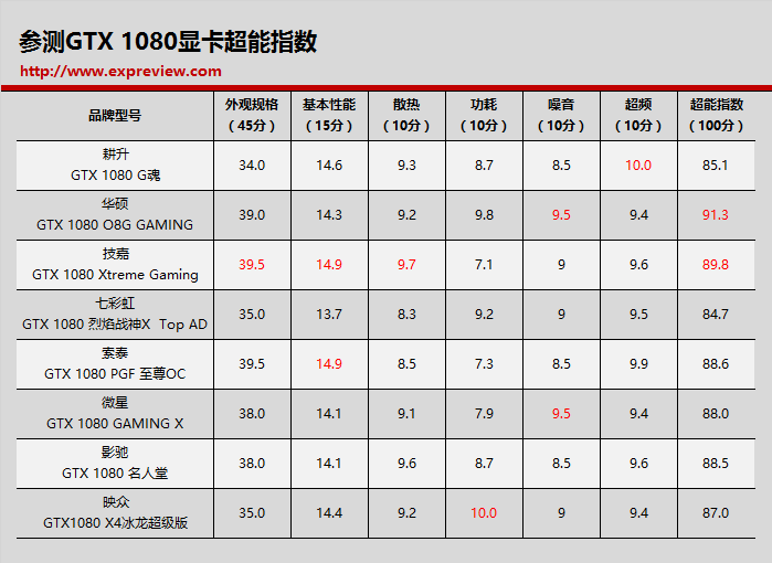 经过一系列的评比、测试后,汇总得出了8款gtx 1080显卡的超能指数。
