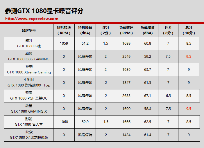待机状态下,华硕、技嘉、七彩虹、索泰、微星、映众都是低温停转,自然没有噪声的困扰。影驰和耕升都保持待机风扇运转的习惯,风扇在1060转下录得噪音51.2db(a)。