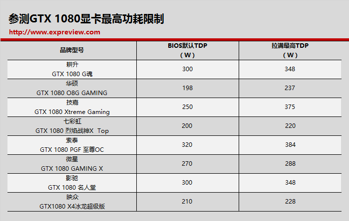 可以看到华硕、七彩虹、映众默认tdp是比较低的,200w左右徘徊,而耕升、索泰、影驰默认tdp都是300w以上,而拉满功耗上限后,tdp最高的是索泰的gtx 1080 pgf 至尊oc,意味着其超频能力宽容度更高,不容易撞上“功耗墙”。