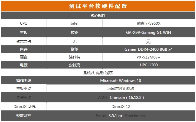 为保证测试能够发挥显卡的最佳性能,本次测试平台采用最强酷睿芯——intel酷睿i7-5960x处理器、技嘉x99芯片组主板、影驰 gamer ddr4-2400 8gb 四通道内存、安钛克1200w金牌电源组建而成。详细硬件规格如下表所示: