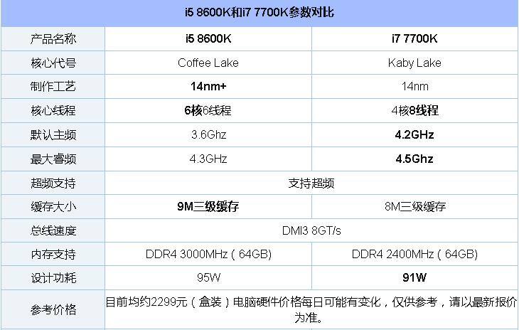 八代酷睿cpu虽然性能提升明显,但价格确实也贵了不少,而七代平台目前价格稳定,下面我们首先来看看目前这两款售价相近的i5 8600k和i7 7700k处理器在参数上有什么区别,具体如下。