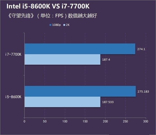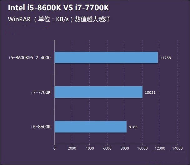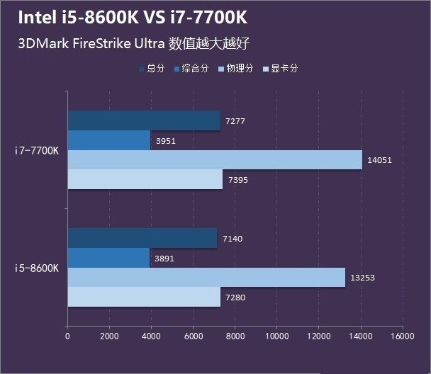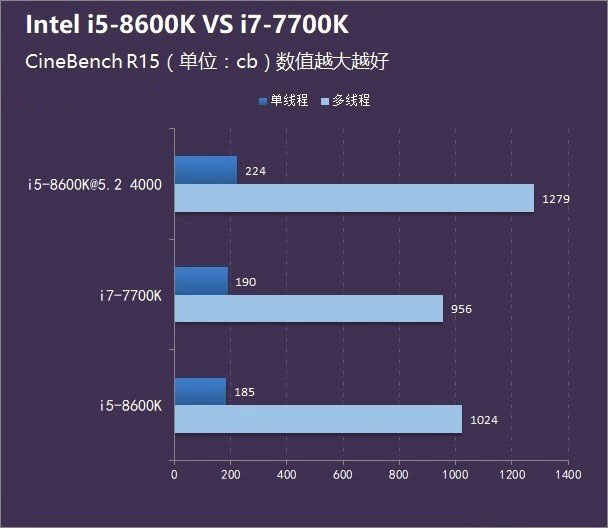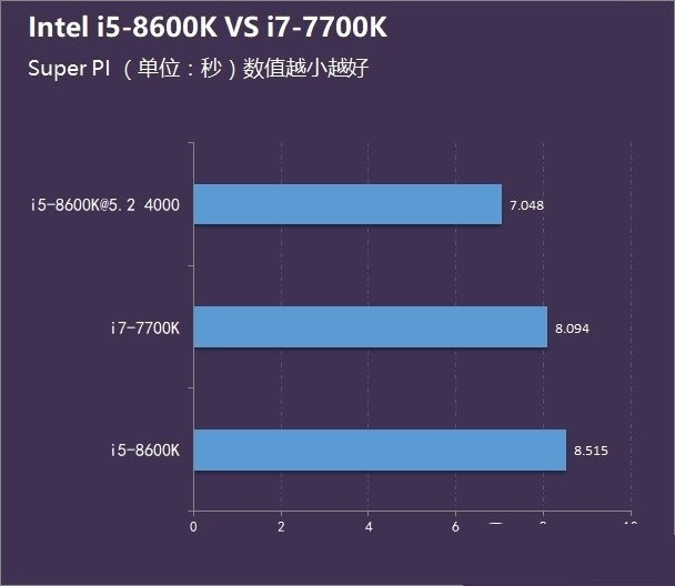 从测试结果来看,在默认频率下,i7 7700k优势明显,不过在超频后,i5 8600k优势就显现出来了。