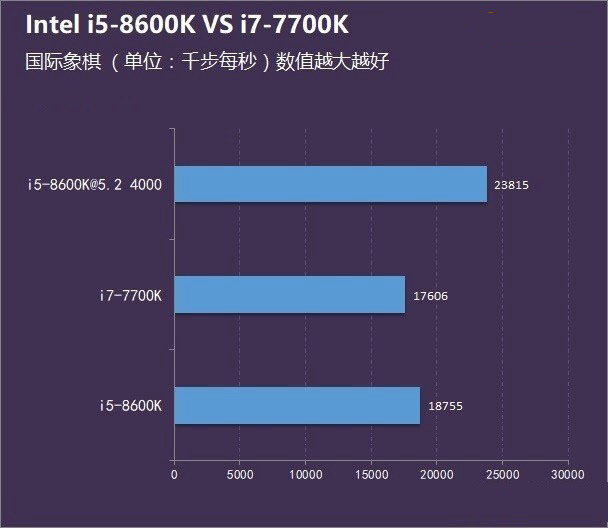 从国际象棋测试成绩来看,i5 8600k无论是在默认频率,还是超频下,运算能力相比i7 7700k显得更强一些。
