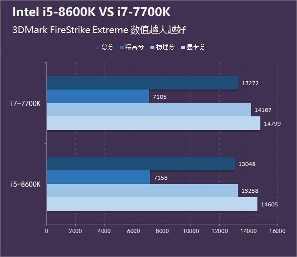 从firestrike的测试结果来看,i5-8600k的跑分略微比上代i7低一点,不过综合分数和总分上没有太大差距。