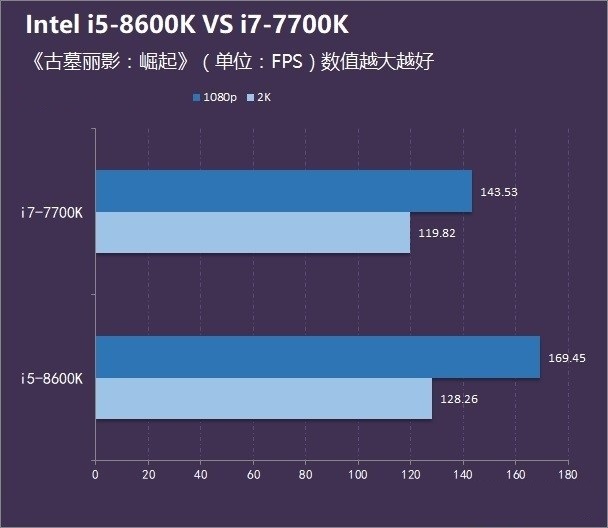 从游戏实测来看,i5 8600k和i7 700k在主流级别《守望先锋》游戏上表现相差不大。不过,在更大一些的《古墓丽影:崛起》游戏中,八代i5 8600k相比i7 7700k表现出了更强的性能的,尤其是1080p画质下,帧率提升了20多针,2k画质下也有10帧左右的提升。这意味着,在大型游戏场景中,i5 8600k原生多核的优势更为明显。