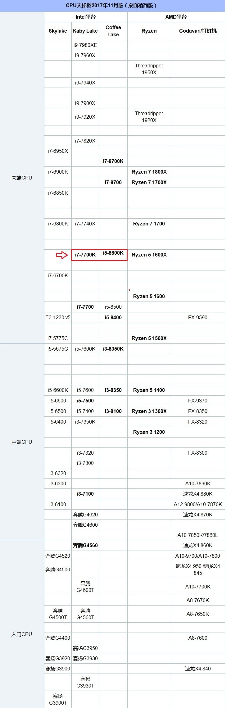 最后来看一下八代i5 8600k和七代i7 7700k在cpu天梯图中的排名,仅供参考。
