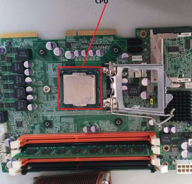 1、提供一个超级准确的方法,如果是整机就拆机,拆到露出如下主板,其中红色框框是存放cpu的地方,现在上面架了风扇。