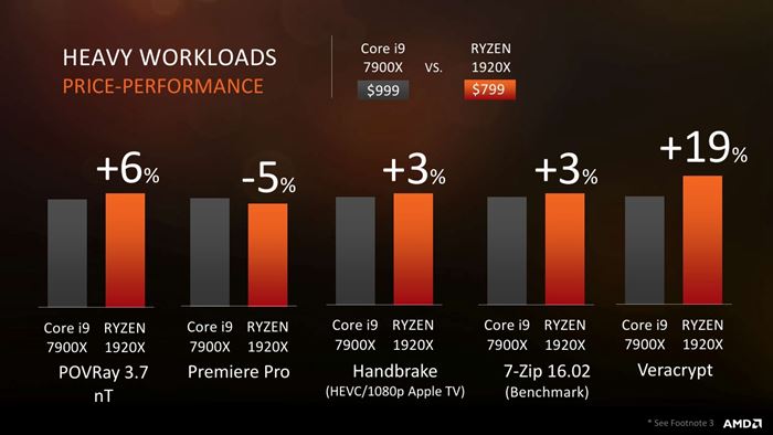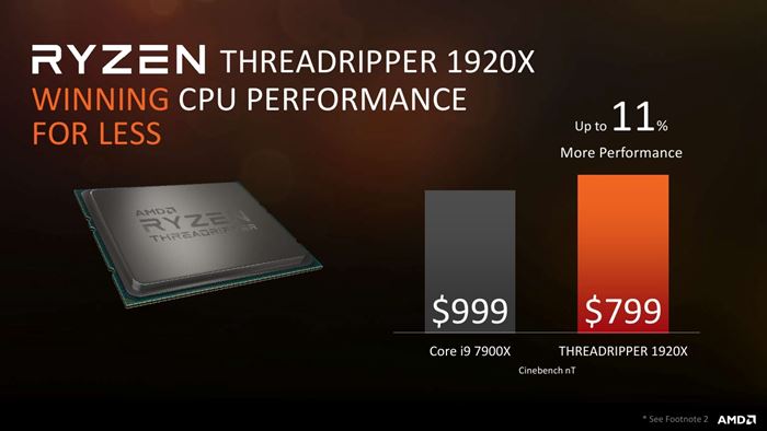 amd还是以intel core i9-7900x作为比较对象,ryzen threadripper 1920x依然领先11%,而且价格上只有799美元,要比intel core i9-7900x便宜200美元。换句话说,更高的性能,更低的价格。