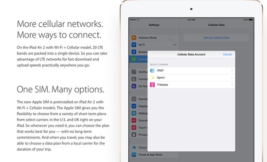 对于之前的各代ipad,从运营商那里购买蜂窝版的ipad都意味着用户将被绑定在该运营商的合约和网络当中。但在新发布的ipad air 2中,强大的苹果改变了游戏规则,他们在ipad air 2中加入了自己的sim卡。在美国,这张apple sim将可以在at&t, sprint和t-mobile的网络中使用,并且相当的强大和灵活。用户可以自主选择自己喜欢的运营商,灵活选择自己的合约时间,甚至可以吃后悔药:如果你对于最初选择的运营商的服务不满意,还可以分分钟切换到当前最合适的运营商的网络上。