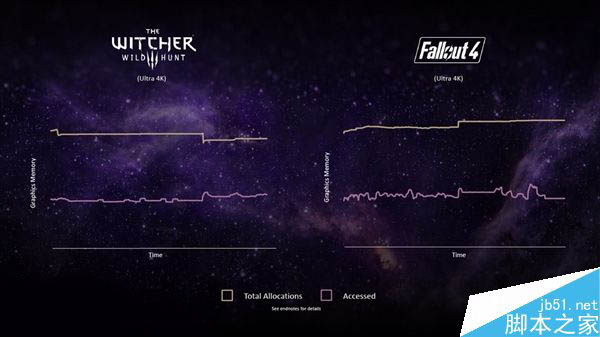 amd还举了两个例子(是游戏而非专业应用),展示了《巫师3》、《辐射4》的显存占用情况,其中大约一半都被浪费了,也就是管理效率很低,而这正是vega要解决的。