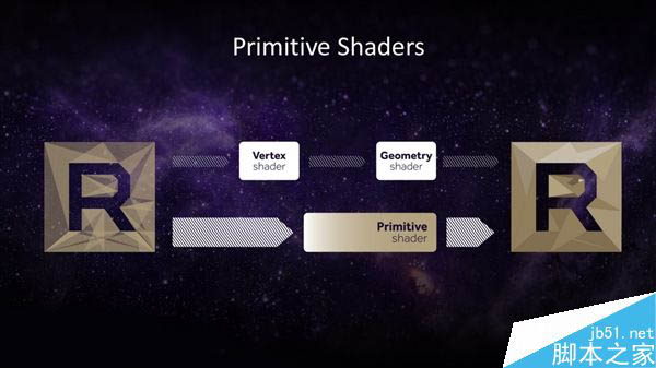 同时,vega的几何引擎还加入了原语着色器(primitive shader),一个新的着色器阶段,和圆通的顶点、集合着色器引擎路径并行,可以高速抛弃隐藏的、没必要的原语。