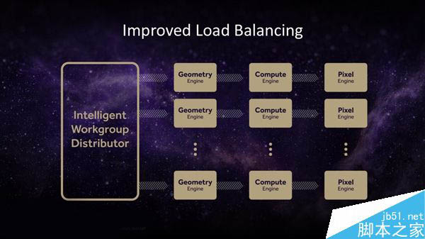 载入均衡也得到了改进,vega通过智能工作组分配器,可以高效率地为计算引擎、几何引擎、像素引擎分派不同的任务负载。