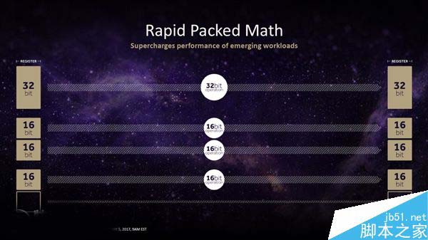 第三点,下一代计算引擎单元(ncu),这也是gcn架构引入以来最大规模的底层革新,每时钟周期可以处理512个8位或者256个16位或者128个32位操作,尤其是可以在单个fp32 alu内处理一对fp16浮点操作,如果彼此兼容的话就可以打包到一起作为fp32进行处理,由此带动峰值吞吐能力翻番。