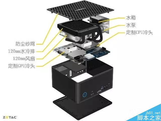 如果有人跟你说,他新买了一台电脑是i7-6700、gtx 1080分体水冷的,你脑海中首先浮现出的样子会不会是这样一个中塔或者全塔机箱?然而索泰en1080把它们放到了这个20公分见方的小盒子里,并且有一套定制的分体式水冷系统!你没看错,i7、1080配合分体水冷。