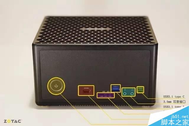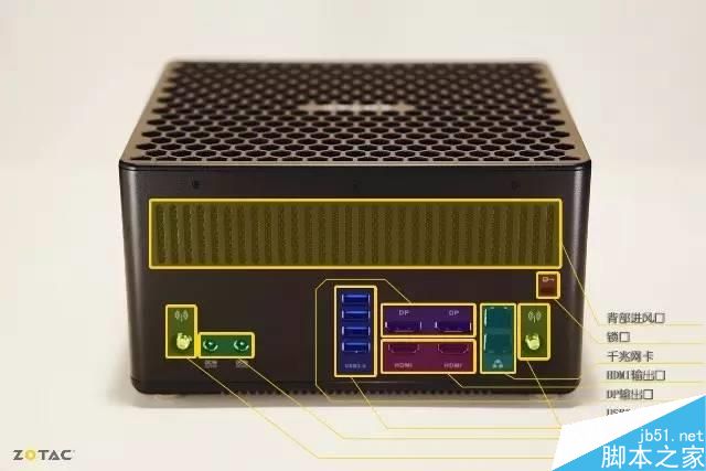机身背部设有两个无线网卡天线接口、两个dc电源接口、两个dp输出口、两个hdmi输出口、两个千兆网口、四个usb3.0 type a接口(终于不是两个了…),以及一个笔记本电脑通用的锁口。