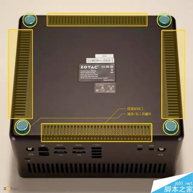 机箱底部有条码标签和四个添加了橡胶脚垫的支腿,同时它们也是免工具螺丝。防滑散热的同时,也降低了拆解升级的难度。底部四边和机身后部有进风口,机箱顶面是一个完整的镂空格栅设计,形成了目前很多玩家推崇的垂直风道。
