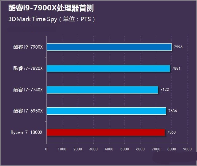 压缩软件测试部分,考量的是处理器线程和主频的综合性能,因此i7-6950x超越了主频更高,但仅有16线程的i7-7820x,不过还是与i9-7900x有一定的差距。dx12测试部分,更多的是看重显卡的性能,cpu只是起到了锦上添花的作用,最终除了四核产品i7-7740x综合得分较低之外,其余几套平台的总分都非常接近。