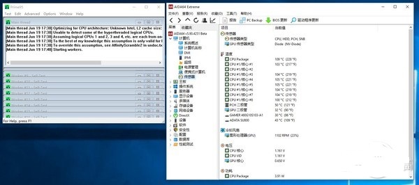 测试小结:待机温度还不错,30+℃,但是一旦满载后,最高温度可以直奔104℃,超频后更是达到110℃,硅脂吖~硅脂吖~还我钎焊。