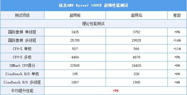 而超频后的性能提升方面,由于有睿频2.0和3.0的加速,i7-7820x本身的性能提升就已经比较大,但8核心同时超频4.8ghz后仍有9%的性能提升。