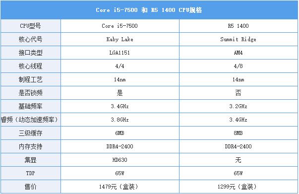 不论是锐龙r5 1400还是core i5-7500都是目前主流玩家最为之关注的2款产品。它们定位相近,价格接近,默认频率i5-7500更高,但不能超频;r5 1400默认频率和动态加速频率都稍有不及,但却可超频。r5没有核显但却有更强大的超线程.........关于这两个cpu,相信不少朋友心中有一个谁强谁弱的疑问。那么今天就放出来作对比吧!