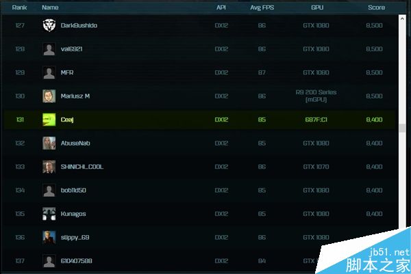 纵向对比,这块型号为687f:c1(接近rx 480,显存不足4g)的神秘卡得分8400,平均帧85fps,完全处于gtx 1080梯队,看齐r9 290双卡cf。