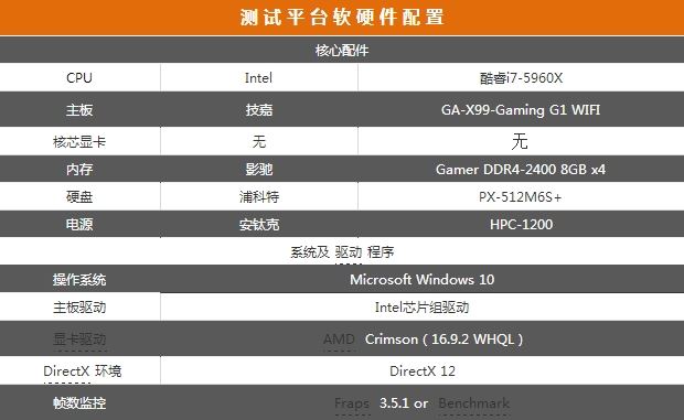 为保证测试能够发挥显卡的最佳性能,本次测试平台采用最强酷睿芯——intel酷睿i7-5960x处理器、技嘉x99芯片组主板、影驰 gamer ddr4-2400 8gb 四通道内存、安钛克1200w金牌电源组建而成。详细硬件规格如下表所示: