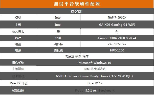 为保证测试能够发挥显卡的最佳性能,本次测试平台采用最强酷睿芯——intel酷睿i7-5960x处理器、技嘉x99芯片组主板、影驰 gamer ddr4-2400 8gb 四通道内存、安钛克1200w金牌电源组建而成。详细硬件规格如下表所示: