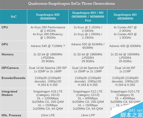 首先我们来对比一下高通近三年的旗舰芯片骁龙810/820/835的参数信息: