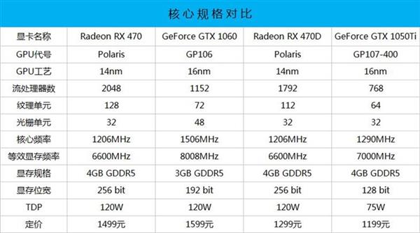 nvidia方面,gtx 1060 3g和gtx 1050ti的规格差距就相当明显了,gtx 1060拥有1152个频率高达1506mhz的流处理器,而gtx 1050ti的流处理器规格则为768个1290mhz的。如果我们认为rx 470的对手是3gb的gtx 1060,那么gtx 1050ti实在很难与接近rx 470的rx 470d相抗衡了。