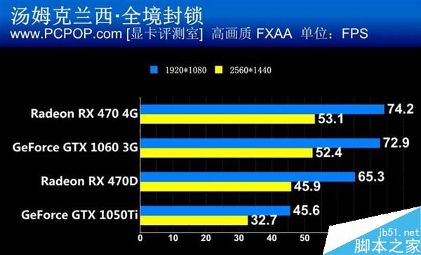《全境封锁》这个游戏,rx 470与gtx 1060的性能又战成了平手。rx 470d在2k分辨率下能够获得45.9帧的成绩也很不错,与1080p分辨率下的gtx 1050ti帧数相当,优势显而易见。