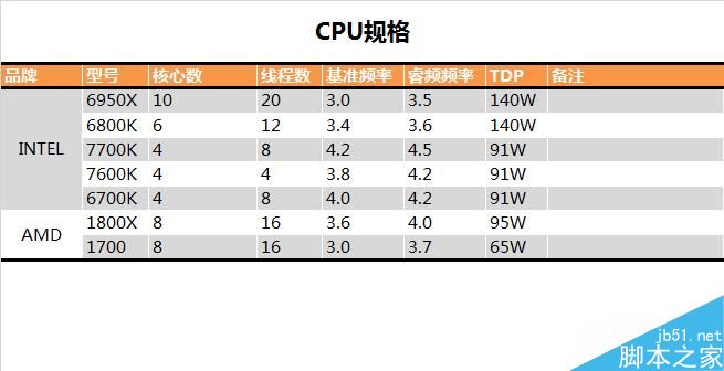 这次一共测试了七颗cpu,7700k、7600k、1800x、1700都是今年新发布的cpu。6950x、6800k、6700k则作为对比组。