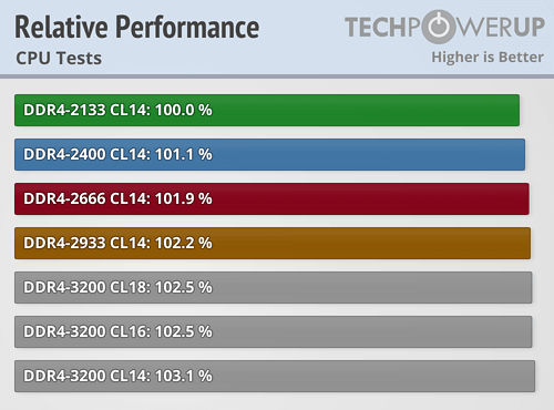 结果十分明显了:amd ryzen 7平台上,最快的ddr4-3200相比于最慢的ddr4-2133性能相差甚微,cpu测试平均只高出3.1%。