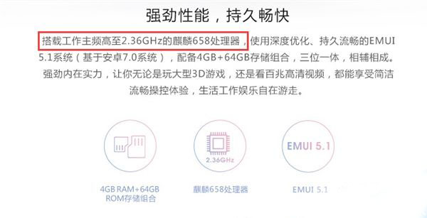 查询华为官网资料可知,麒麟658应该就是麒麟655的升级版,提升频率为主,还是集成八个a53 cpu核心,分为四大四小,其中四个大核心的主频从2.1ghz提高到2.36ghz,四个小核心则还是1.7ghz。