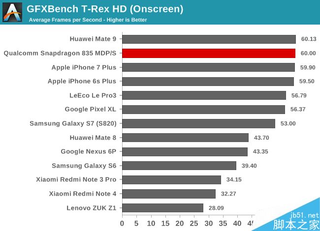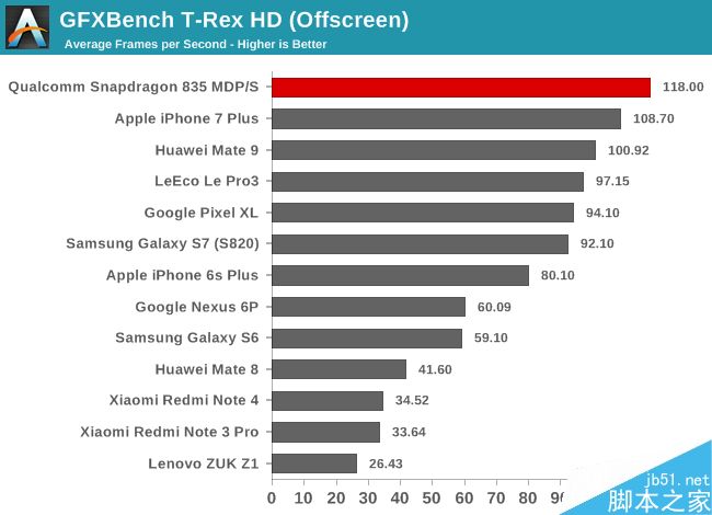 gfxbench霸王龙测试基于opengl es 2.0,骁龙835很凶猛,跑出了118fps,成功超越苹果a10。