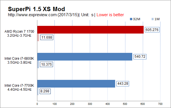 superpi 1.5 xs mod 1m与32m的测试,考验处理器的单核运算能力,这个拥有超高主频的core i7-7700k毫无疑问的占尽优势。