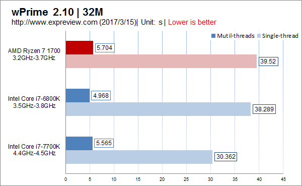 wprime 2.10 32m测试,拥有八核心的ryzen 7 1700在多线程测试里并没有占到多少优势,毕竟频率偏低结果败给了两颗intel处理器。