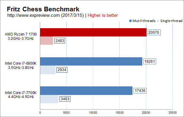 fritz国际象棋测试,八核的ryzen 7 1700在多线程测试里领先是正常的,单线程测试由于主频偏低输了也正常。
