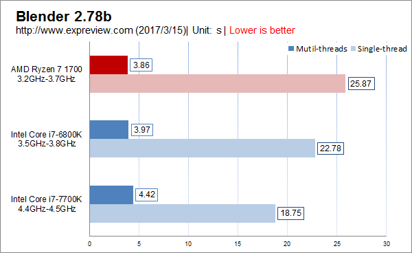 blender 2.78b测试,多线程测试里ryzen 7 1700凭借着核心数量多占有优势,单线程测试就比较糟糕了。