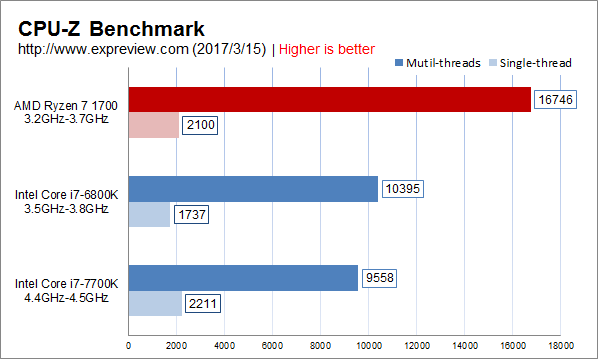 cpu-z的性能测试,ryzen 7 1700这里就大幅度领先了