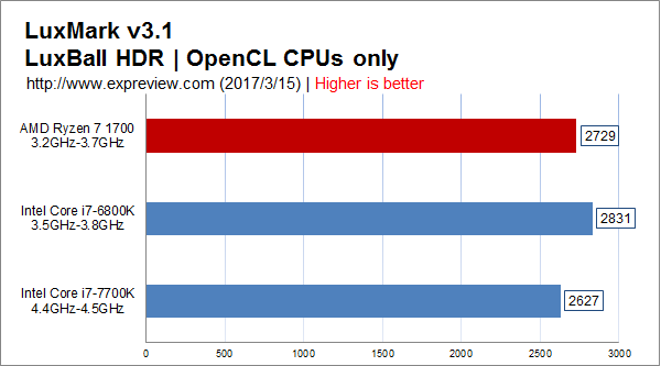 luxmark 3.1 luxball hdr opencl cpu only,ryzen 7 1700的性能介于core i7-6800k与core i7-7700k之间,它的最大问题就是默认频率太低了。
