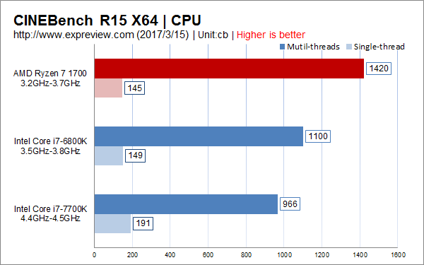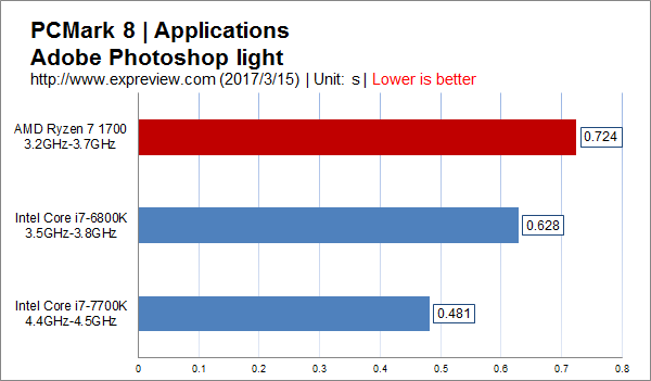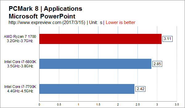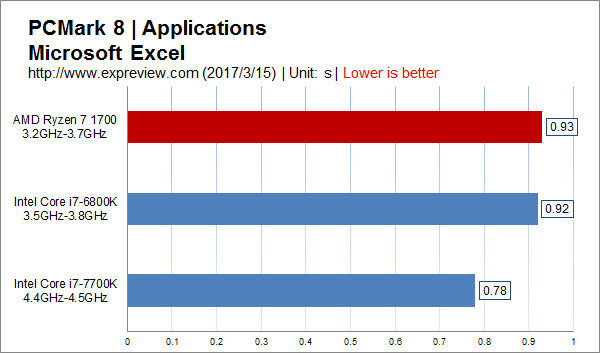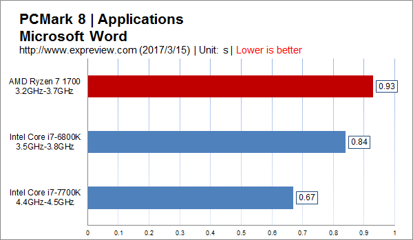 可见在对cpu负载并不高的office应用里面,核心数多而频率低的ryzen 7 1700的多线程优势并没有发挥出来,高频还是很重要的。