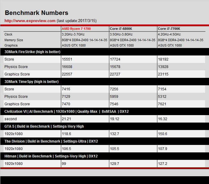 游戏性能测试,两个3dmark里面锐龙 amd ryzen 7 1700的物理得分确实比两个core i7高得多,不过实际游戏性能方面频率还是占很大因素的,多核没有占到什么好处。