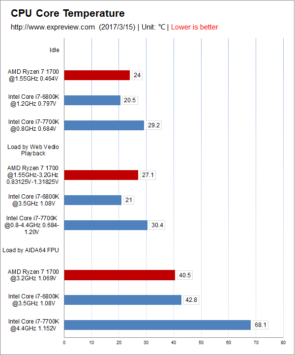 ryzen 7 1700的待机频率为1.55ghz,电压0.464v,这次表现正常多了,待机温度只有24℃介于core i7-6800k与core i7-7700k之间。观看在线视频时ryzen 7 1700的频率在1.55ghz到3.2ghz之间波动,电压则在0.83v到1.32v之间变动,核心温度轻微上升到27℃,依然介于core i7-6800k与core i7-7700k之间。用aida64的fpu测试来负载的话ryzen 7 1700频率会固定在3.2ghz,电压为1.069v,此时他的温度是最低的只有40.5℃,温度表现相当的好,而那个内部涂硅脂的core i7-7700k温度则高达68.1℃。